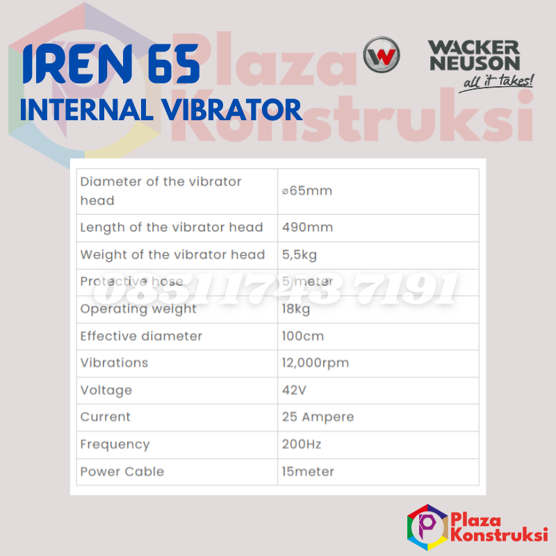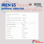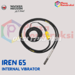 High Frequency Internal Vibrator Wacker Neuson Iren 65 High Frequency Internal Vibrator Wacker Neuson IREN 65 adalah selang yang menyalurkan listrik dengan frekuensi tinggi yang disupply oleh unit Converter untuk menggerakkan head motor sehingga menggerakkan bandul yang ada di dalam head. Biasa digunakan sebagai pemadat beton cair, tersedia dalam 5 ukuran head, 30, 38, 45, 57, 65 mm. Operator hanya perlu mencelupkan vibrator head ke dalam beton cair sehingga tidak ada celah atau gelembung pada beton, banyak diaplikasikan pada pekerjaan pengecoran dinding, kolom bridge casting, konstruksi bangunan gedung. Pengoperasian menggunakan tenaga listrik, sehingga tidak menimbulkan polusi baik untuk lingkungan maupun orang lain. IREN 65 dilengkapi dengan beberapa fitur seperti, switch box terbuat dari technical plastic (PA) dirancang agar tahan terhadap air, semen, dan abrasi. Frekuensi serta amplitudo pada IREN 65 menjamin pemadatan beton secara optimal.